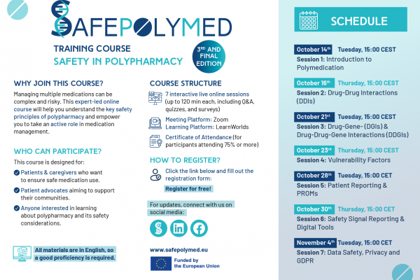 Following the success of the previous editions, SafePolyMed, under the lead of project partner LeukaNET e.V. and with support from Patvocates GmbH, is launching a third and final free online training course on safety in polypharmacy in October.