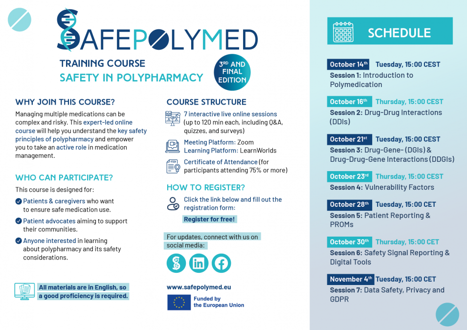 Polymedication, the simultaneous use of several medications, can cause adverse drug reactions. However, not all patients, caregivers, and patient advocates are aware of the risks and vulnerability factors. The course Safety in Polypharmacy aims to improve knowledge on these issues. It also aims to equip and encourage patients to take an active role in managing their own health. Seven separate sessions throughout October and November will inform participants about the following topics: